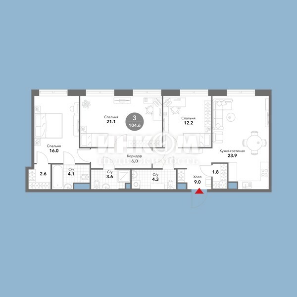 4-комнатная квартира, 16 этаж, 104.6 м2