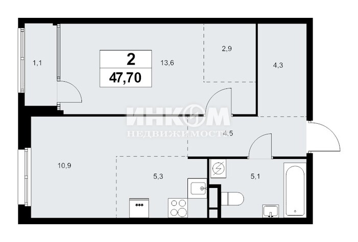 2-комнатная квартира, 6 этаж, 47.7 м2