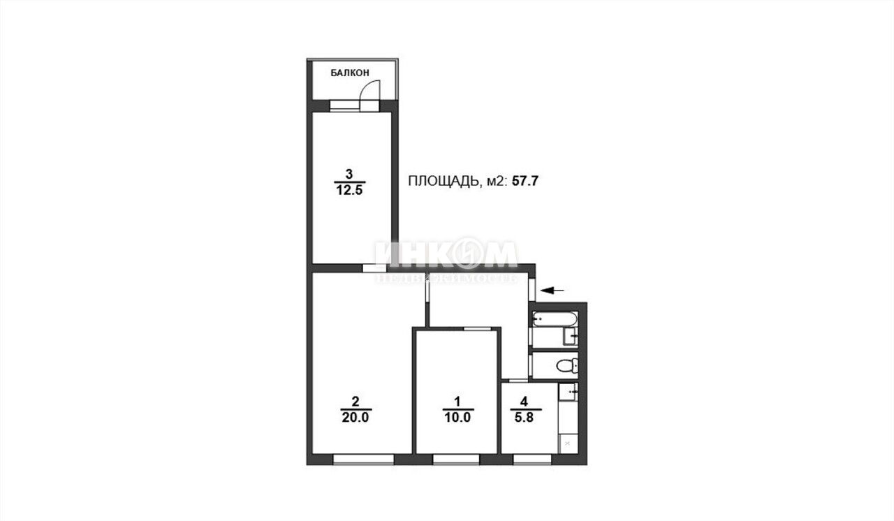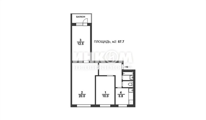 3-комнатная квартира, 4 этаж, 57.7 м2