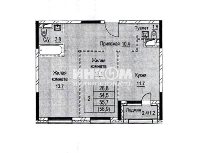 Продажа 2-комнатной квартиры, 56.9 м², этаж 13/26