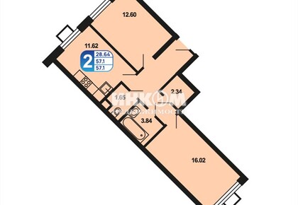 2-комнатная квартира, 57.1 м², этаж 6/16