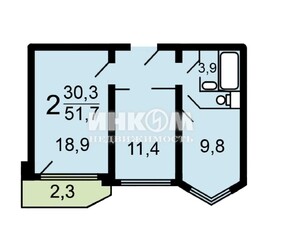2-комнатная квартира, 51.2 м², этаж 9/14