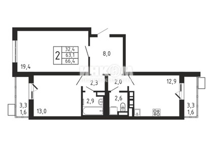 2-комнатная квартира, 66.4 м², этаж 5/9