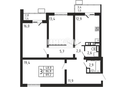 3-комнатная квартира, 89.4 м², этаж 3/6