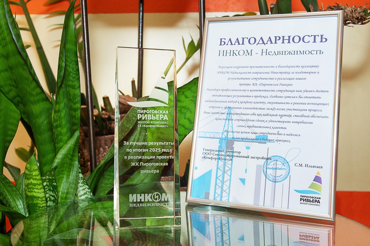 ИНКОМ-Недвижимость получила благодарность и награду от московской строительно-инвестиционной компании «КомфортИнвест» за лучшие результаты по итогам 2025 года в реализации проекта ЖК «Пироговская Ривьера».